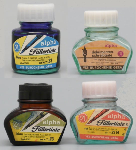 Alpha Füllertinte hergestellt von der VEB Bürochemie in D-Gera. Die VEB Bürochemie entstand aus der 1829 in Dresden gegründeten Tinten- und Tuschefabrik Leonardi.